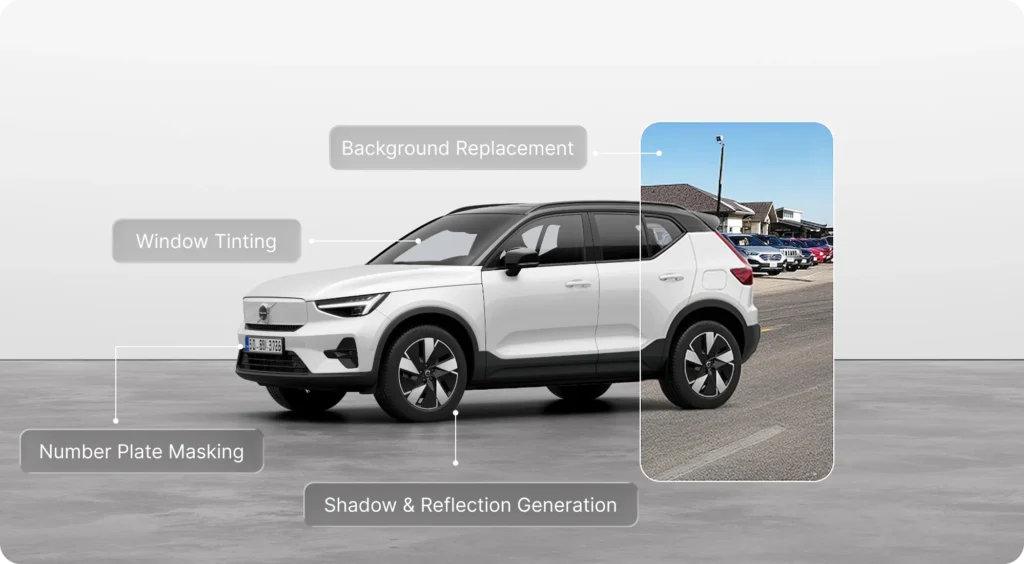 PhotoRoom includes background replacement, reflection removal, shadow generation, number plate masking, and window tinting, all within a single workflow.